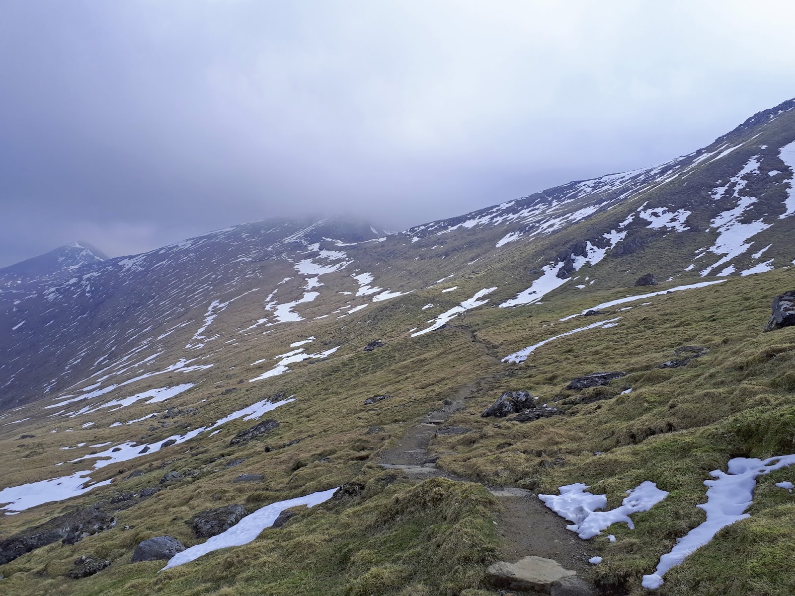 When I reached the bealach the pair ahead turned left, heading up Meall Corranaich, which gave me a jolt as I had just been following them assuming they were doing the same as me. At the same juncture my rough track curved round the side, boulders and snow en route, slight concern as nobody else here but footprints in the snow.