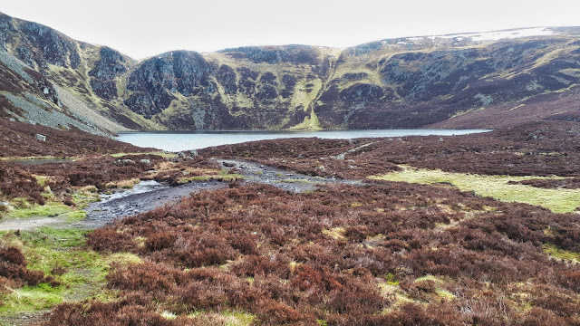 Firstly heading across the barren top to reach another cairn, this time Ben Tirran would you believe. Then an easy descent across grass and heather with excellent views of the corrie surrounding Loch Wharral, another impressive piece of landscape.